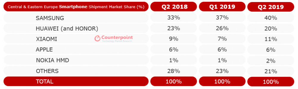 Como podemos ver en el cuatro de la empresa consultora, Samsung ha subido nada menos que un 7% en cuota de mercado en Europa del este y Europa central. Es la única que ha subido tanto interanualmente, desde el primer trimestre de 2018 al primero de 2019, como intertrimestralmente, desde el primero al segundo trimestre de este año.