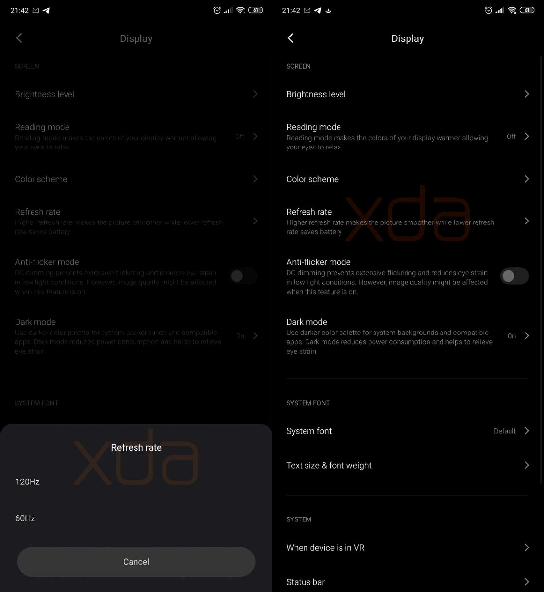 Otra fuente, en este caso XDA Developers, nos ha enseñado una captura de pantalla extraída de un versión beta de MIUI 11 en la que podemos ver un nuevo ajuste en el que se puede cambiar la tasa de refresco de la pantalla, que pasaría de los 60 Hz normales a los 120 Hz.