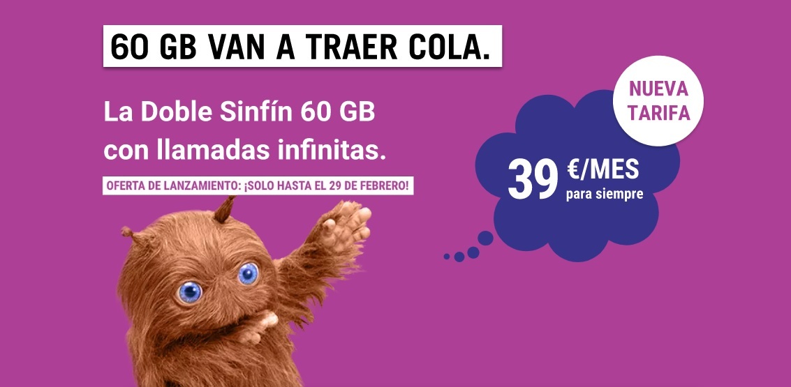 El operador la presenta como la tarifa más Yoigo que nos dejan hasta el momento. Esta tarifa Doble Sinfín 60 GB incluye dos líneas móviles con 60 GB a compartir entre ambas y llamadas infinitas, por solo 39 euros al mes para siempre desde el momento en el que se contrata (siempre y cuando se contrate antes de la fecha final de esta promoción, que es el 29 de febrero).