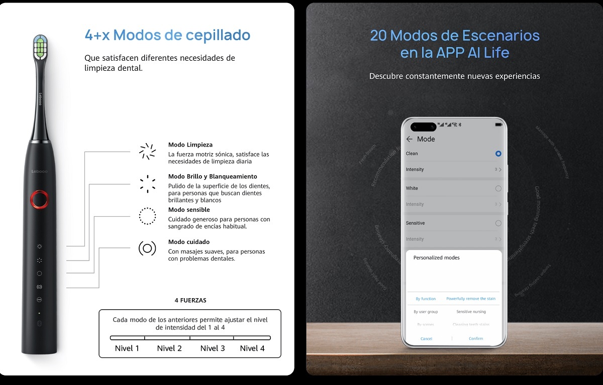 Tiene un total de 36 modos de limpieza diferentes, entre los que nos encontramos con un modo especial para dientes y encías sensibles o uno para blanqueamiento. Por otro lado, tiene un total de cuatro niveles de fuerza, que se pueden configurar en la app. En el cepillo hay un sensor de presión, que detectará el cepillado y nos dirá cuando debemos presionar menos, para evitar causar daños en dientes o encías.