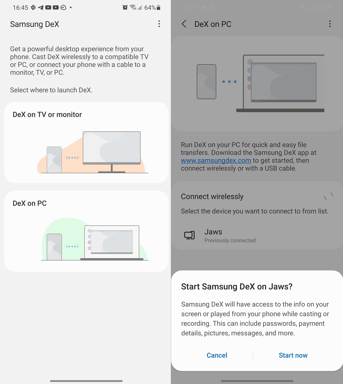 Cuando abras Samsung DeX tendrás que actualizar a la última versión de DeX para PC. Una vez hecho esto, tienes que usar la configuración rápida, donde podrás elegir el dispositivo deseado para conectarse y entonces se llevará a cabo dicha conexión. En el propio PC te saldrá un mensaje donde se te avisa de que se ha realizado la conexión.