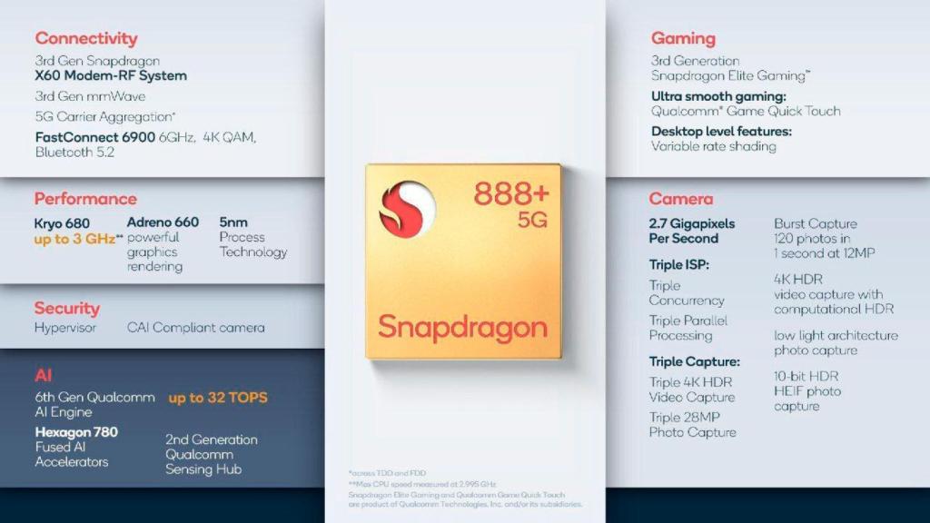 El Snapdragon 888 Plus tiene las mismas especificaciones que su antecesor, pero cuenta con una velocidad de reloj máxima en el núcleo de alto rendimiento que llega a los 3 GHz, en vez de quedarse en los 2.84 GHz que tenía el 888. Los otros siete núcleos permanecen inalterables.
