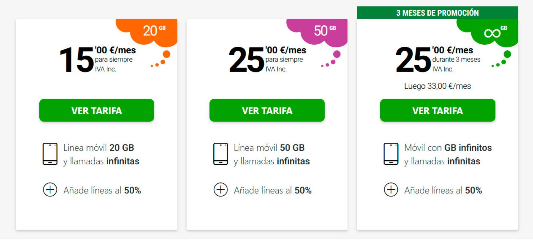 - Tarifa LA SINFÍN 50 GB: llamadas nacionales ilimitadas y 50 GB. Precio: 25 euros/mes.