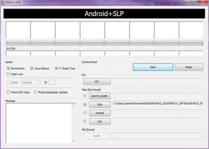 - Abrimos Odin y lo configuramos de la siguiente manera: I9100XWKJ2_I9100XXKI4_I9100XEFKJ1_HOME.tar.md5 en PDA. Y ya está. Recordad que tenéis que venir de una 2.3.4