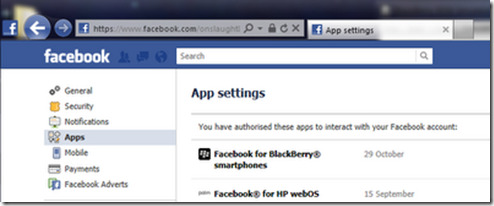 5. Ve a Ajustes de cuenta -> Aplicaciones y asegúrate de que ‘Facebook for Blackberry Smartphones’ está autorizado. Si no, vuelve a iniciar la sesión desde el emulador otra vez