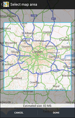 Para una mejor gestión de los mapas, no te descarga todos de una vez, si no que tendrás que ser tu el que seleccione las zonas que quiere que guarde. Podremos acceder a esta opción simplemente pulsando el botón Menú y marcando Disponible Sin Conexión. Con los dedos, marcaremos el área que queremos que descargue y el área que por tanto tendremos disponible offline, una forma muy intuitiva y sencilla.
