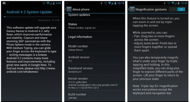 Los poseedores de los Galaxy Nexus versión GSM, han empezado a recibir via OTA una la actualización, y como vemos en las imágenes es Android 4.2 lo que se les instala, además ya se puede descargar la actualización manualmente e instalarla desde los servidores de Google, pero como siempre, lo más recomendable es esperar a que llegue naturalmente la actualización para no tener que flashear manualmente, por si somos profanos en el tema.