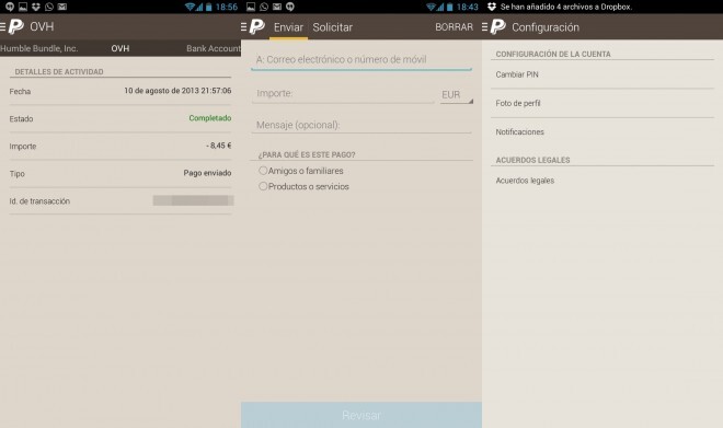 Lo primero es lo primero que podemos ver, ya que la interfaz ha sido rediseñada dando paso a una interfaz mucho más intuitiva y fácil de utilizar: ahora disponemos de barra lateral (muy buen trabajo siguiendo las líneas de estilo de Android si la comparamos con la anterior versión) y menús completamente rediseñados, como podéis ver en la imagen. Pero todas estas mejoras y correcciones de bugs no son el plato fuerte que PayPal ha presentado en el anuncio de la actualización…