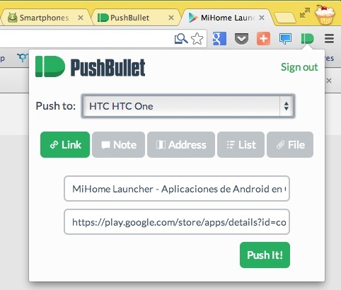 Si usas más el Chrome que la opción de compartir a otros móviles, el compañero perfecto de PushBullet es la extensión para Google Chrome que encontrarás en su tienda de aplicaciones que te facilitará la posibilidad de enviar y compartir archivos entre tu ordenador y tu móvil.
