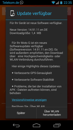 Uno de los teléfono de los que más se está hablando estos días es el Motorola Moto G, que tiene muchas posibilidades de convertirse en uno de los regalos estrella de estas navidades. Ya os contamos cómo y dónde comprarlo y si todavía no lo conocéis no dudéis en leer el extenso análisis que nuestro compañero Danny hizo hace unos días del Moto G. Hoy el último terminal de Motorola y con el que pretende revolucionar la gama media vuelve a ser noticia, y es que empieza a recibir su primera actualización vía OTA.
