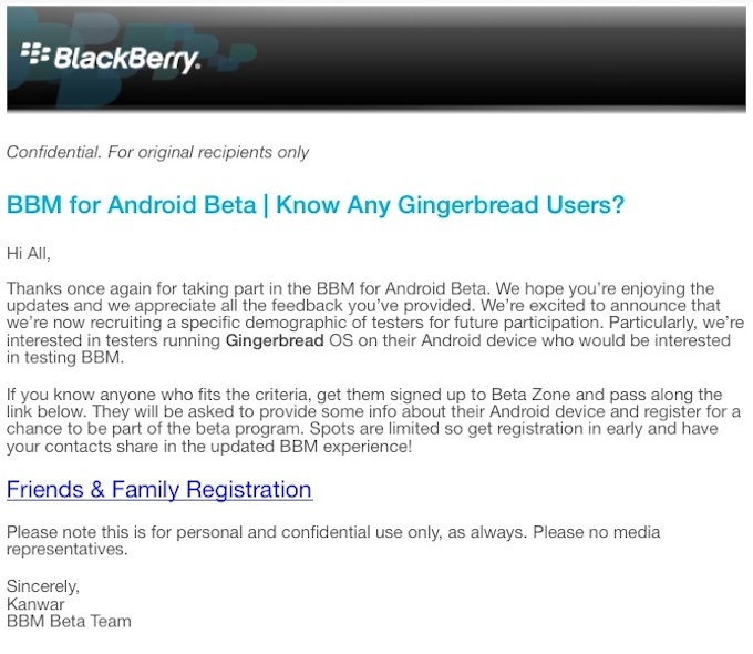 De momento BBM solo es compatible con dispositivos con Ice Cream Sandwich o superior, sin embargo en los foros de la beta se explica que están reclutando un grupo específico de betatesters con dispositivos Gingerbread para ir viendo los resultados. Una quinta parte de los usuarios de Android no tiene acceso al servicio de mensajería de Blackberry por lo que ahí ven muchísimo potencial.