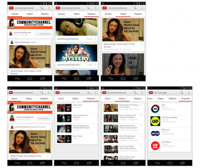 Las páginas de usuario se han renovado al modo cards, pasando de las tarjetas más grandes a algo más compacto. Se incluye además pestañas para tus canales junto al de tus playlist. La información además se presenta mejor resumida como se aprecia en la foto de abajo. (Antigua versión arriba, nueva abajo), aunque desgraciadamente parece ser que esta opción solo apareció en la versión Dogfood, y los que actualicemos via Google Play tendremos que esperar.