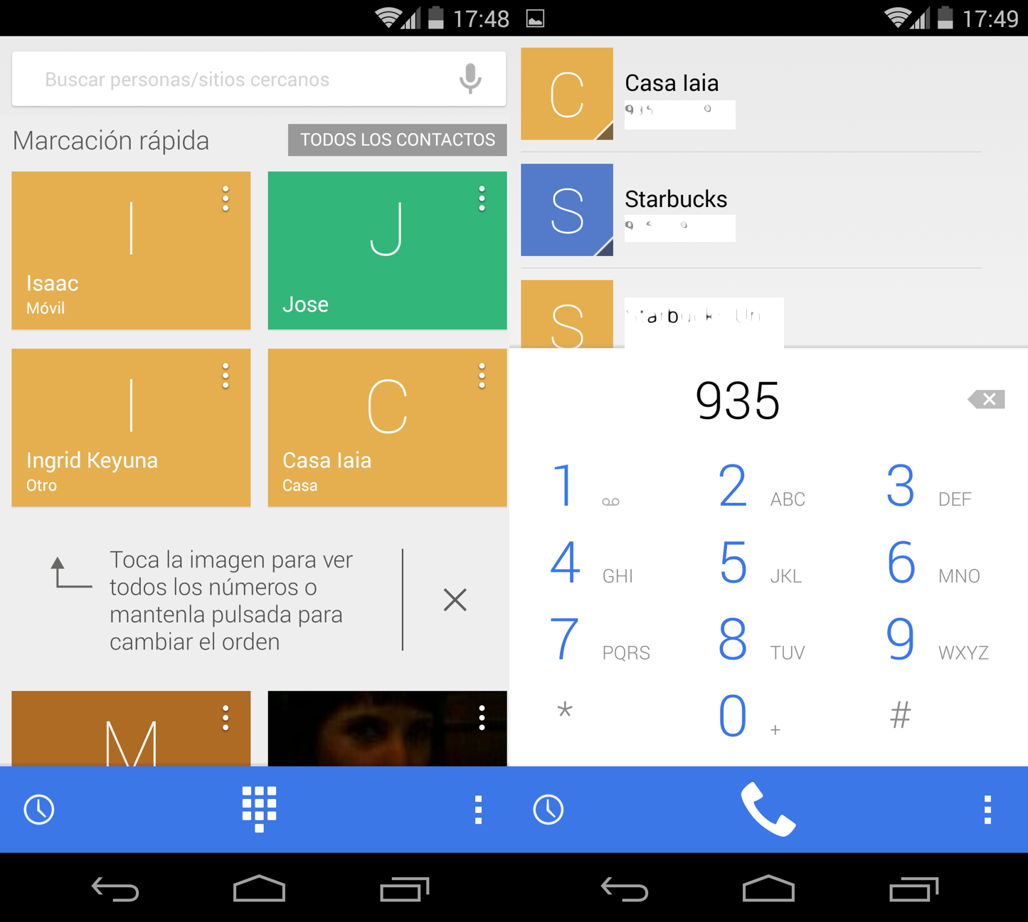 El nuevo Dialer presenta un diseño más visual, donde los contactos se muestran con miniaturas más grandes (en caso de haberles asignado fotos) o con la letra inicial de su nombre, al estilo GMail. Un marcado tono azul es ahora el color predominante en las barras de la App y tanto el marcador como la zona del historial han recibido cambios estéticos.