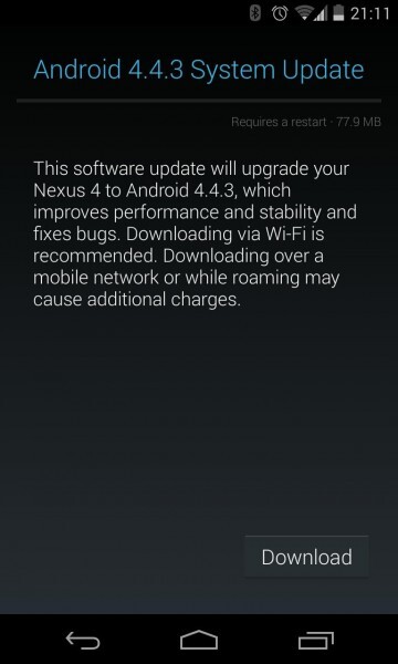 La OTA del Nexus 4 pesa 77.8MB y de nuevo necesitaremos estar ya en Android 4.4.2 para instalarla.