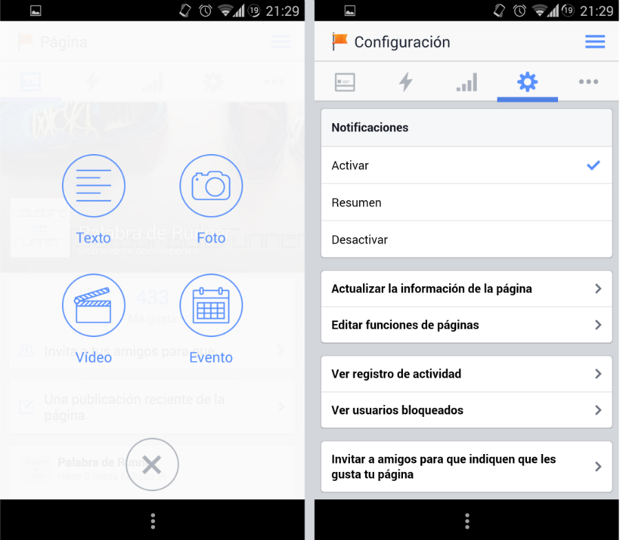 Ahora todo está mucho más claro, se deja atrás el menú lateral de navegación para ahora navegar deslizando entre las pestañas de la propia Pagina, Actividad (donde ver las notificaciones, mensajes, estadísticas y gráficos de la página), otra pestaña de Estadísticas más detalladas con cambios entre períodos y los ajustes.