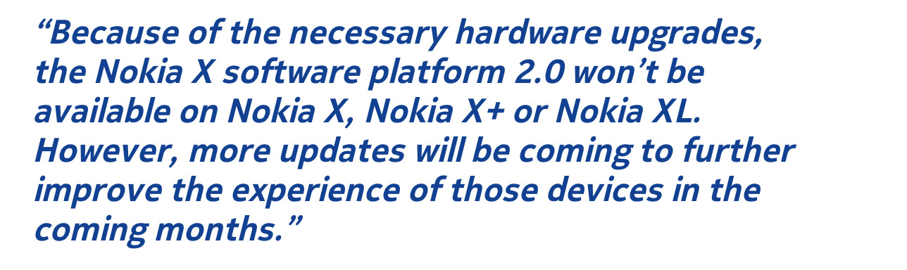 De la misma manera que ya hicieron con el cambio de versión en Windows Phone, los Nokia originales X, X+ y XL no recibirán esta actualización. Únicamente han pasado 4 meses, pero parecen ser suficientes como para considerar su producto anticuado y no merecedor de esta nueva versión.