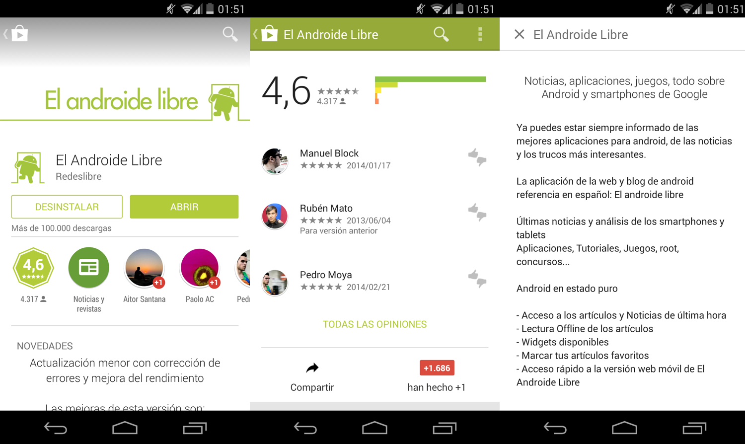Las descripciones de las apps ahora van en pantalla completa, al igual que los changelogs. Los avatares son circulares y desaparece ese tono grisáceo en muchas pantallas, tampoco vemos quién ha realizado los +1 junto al botón, aunque sí en los avatares justo debajo de la cabecera.