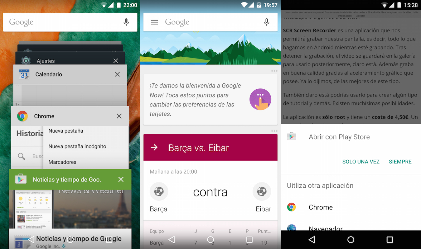 Lollipop además viene con la nueva versión de Google Search donde por supuesto se añade Material Design y varios accesos rápidos a los ajustes. OK, Google funciona genial desde cualquier pantalla pero todavía no en español, algo que esperamos solucionen pronto.