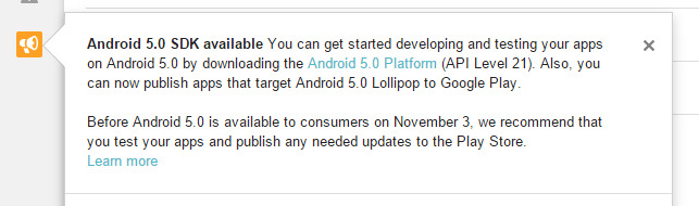 Aquí os dejamos el mensaje directo que viene a decir lo siguiente. El Android 5.0 SDK estará disponible el 3 de Noviembre y será entonces cuando se recomienda publicar aquellas apps que se aprovechen de las nuevas APIs presentadas.