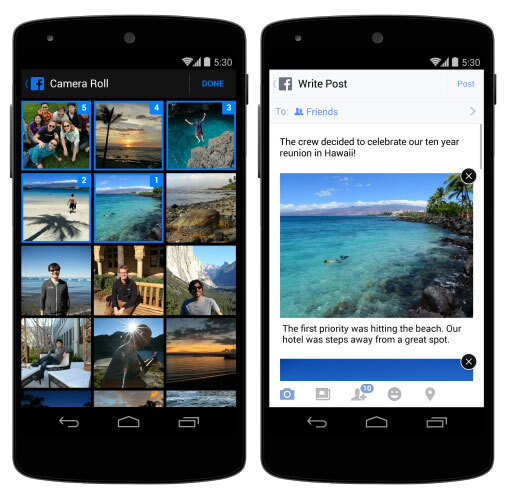 Facebook, en su versión 22.0.0.0.2 permite subir fotografías desde nuestra galería de forma ordenada. Así como la posibilidad de añadir textos entre cada unas a modo de historia. Lo que quiere decir esto es que a la hora de la subida se nos mostrará un número que indicará el orden en el que aparecerán.