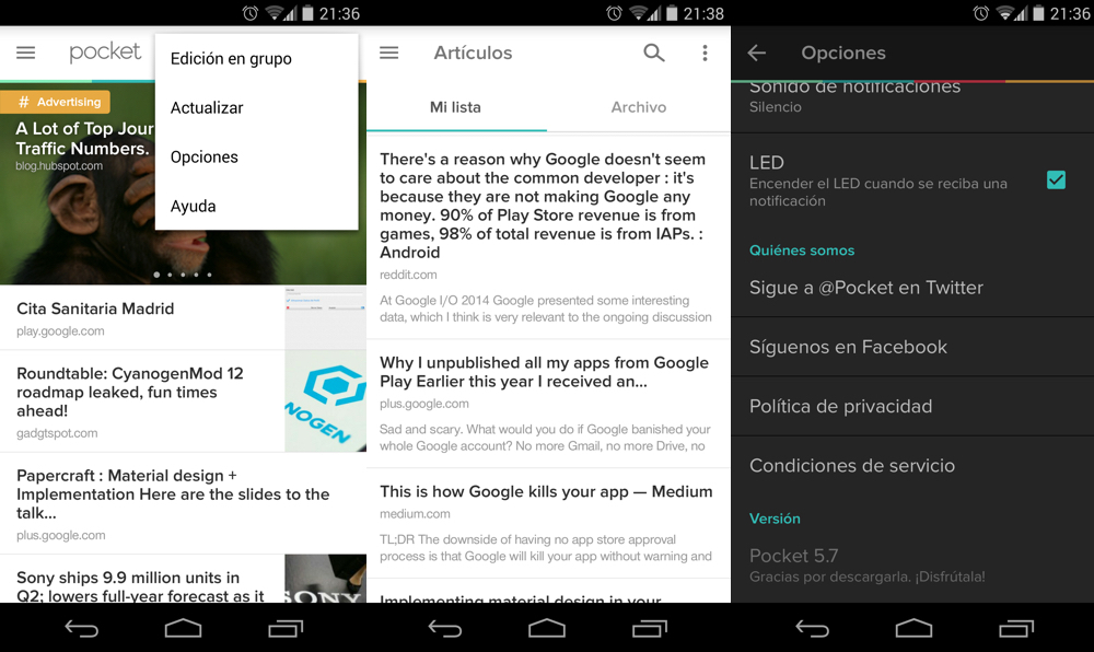 Otra de nuestras aplicaciones imprescindibles. Se trata de Pocket y se actualiza a la versión 5.7. No tenemos ninguna gran actualización entre manos pero por fin los desarrolladores de Pocket se han puesto manos a la obra y se incorporan los primeros detalles de Material Design, como es el menú lateral y la lista de artículos.