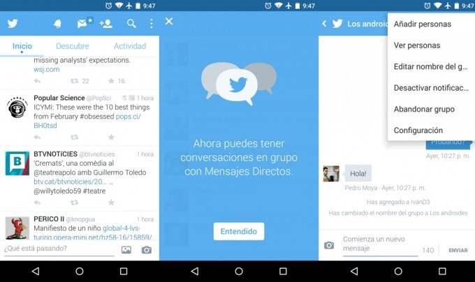 Además, Twitter reclama su pequeña parcela dentro del mundo de la mensajería instantánea, permitiendo a partir de ahora realizar mensajes directos en grupo, cosa que hasta ahora sólo permitía entre dos usuarios, permitiendo así maximizar el marujeo entre tuiteros del tipo «fíjate tú lo que ha dicho ese» sin que nadie se entere. Larga vida al #intratwitter.