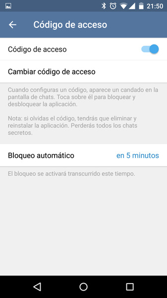 La nueva versión de Telegram 2.5 incluye nuevas mejoras de seguridad para el acceso de la aplicación. Podremos establecer un PIN que tendremos que introducir cuando bloqueemos y pase un tiempo de inactividad desde que cerramos la aplicación. Muy útil para evitar que otros ojos visiten nuestros chats y algún amigo gracioso que quiera decir algo a cierta persona.