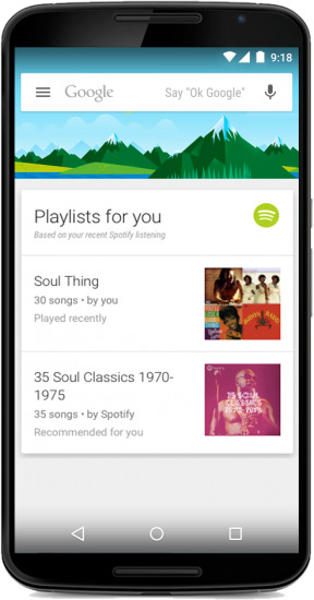 Para ello, Google se ha asociado con más de 70 desarrolladores para hacer de la experiencia de Now lo más completa posible. Desde ahora, Now podrá recomendarte listas de reproducción para SpotifyTuneIn Youtube, todas basadas en tus gustos musicales de forma automática, ya que como algunos sabréis, Now nos ofrece información sin necesidad de preguntar.