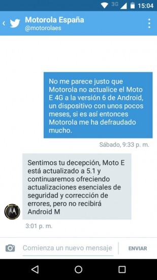 La foto de la discordia es la que tenéis sobre estas líneas, que nos muestra una conversación entre un usuario y la división española de Motorola. Como podéis ver, el mensaje del usuario es claro, se queja de que el Moto E no aparezca en aquel listado provisional, y la respuesta de Motorola también es clara, que el Moto E no actualizará y se quedará en Android 5.1.