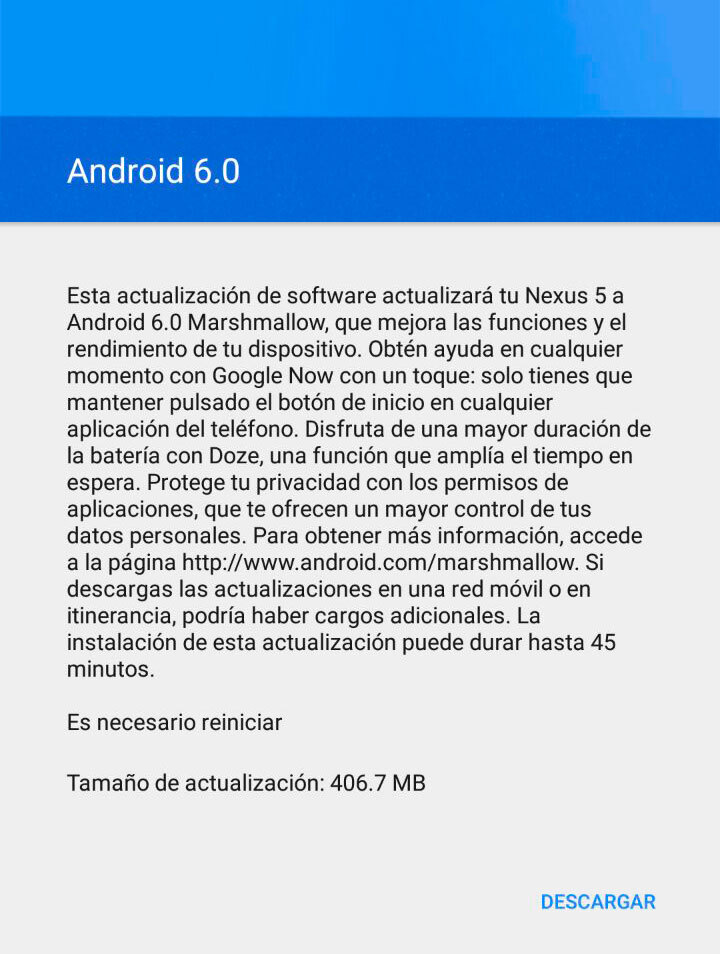 Hace días que Google liberó la última versión de su sistema operativo y los más impacientes lo instalaron de forma manual en su dispositivo, pero tras una espera no tan larga la OTA de Android 6.0 Marshmallow ya está llegando a teléfonos Nexus 5 y 6, además de las tabletas Nexus 7 y 9, y también para el Nexus Player.