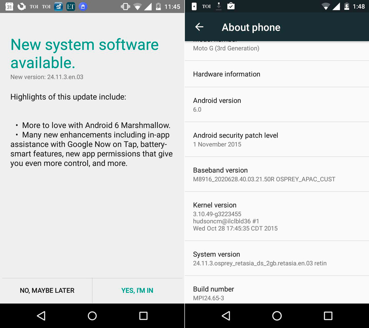 La noticia nos llega a través del Google+ de Ajmal Khadar, que comenta que a un usuario de su círculo de amigos le ha llegado la mencionada actualización. La actualización, que incluye Android 6.0 y el parche de seguridad del 1 de noviembre, entre otras mejoras de la cosecha de Motorola, está disponible para estos usuarios que están registrados como betatesters en Motorola, y la versión cuenta con el número 24.11.3.en.03.