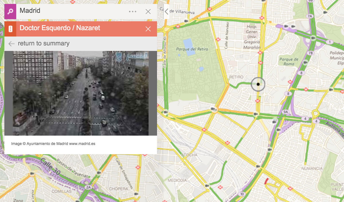 Al pulsar sobre ellas, se abrirá una ventana emergente con una captura de la cámara, mostrándonos la situación actual en el lugar que queramos ver. Esas imágenes son cortesía del ayuntamiento de cada ciudad, el equipo de Microsoft afirma tener más de 35.000 cámaras en 11 países, y ciudades como Madrid o Barcelona cuentan con varias cámaras repartidas por toda la ciudad.