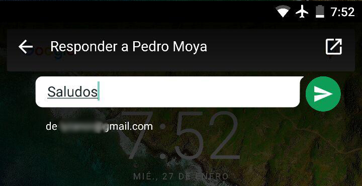 El añadido más importante es la incorporación de las respuestas rápidas. Cuando nos aparezca la notificación de un mensaje de hangouts, podremos clickar en responder desde la propia notificación y entonces nos aparecerá este popup que nos permite enviar un mensaje rápidamente.