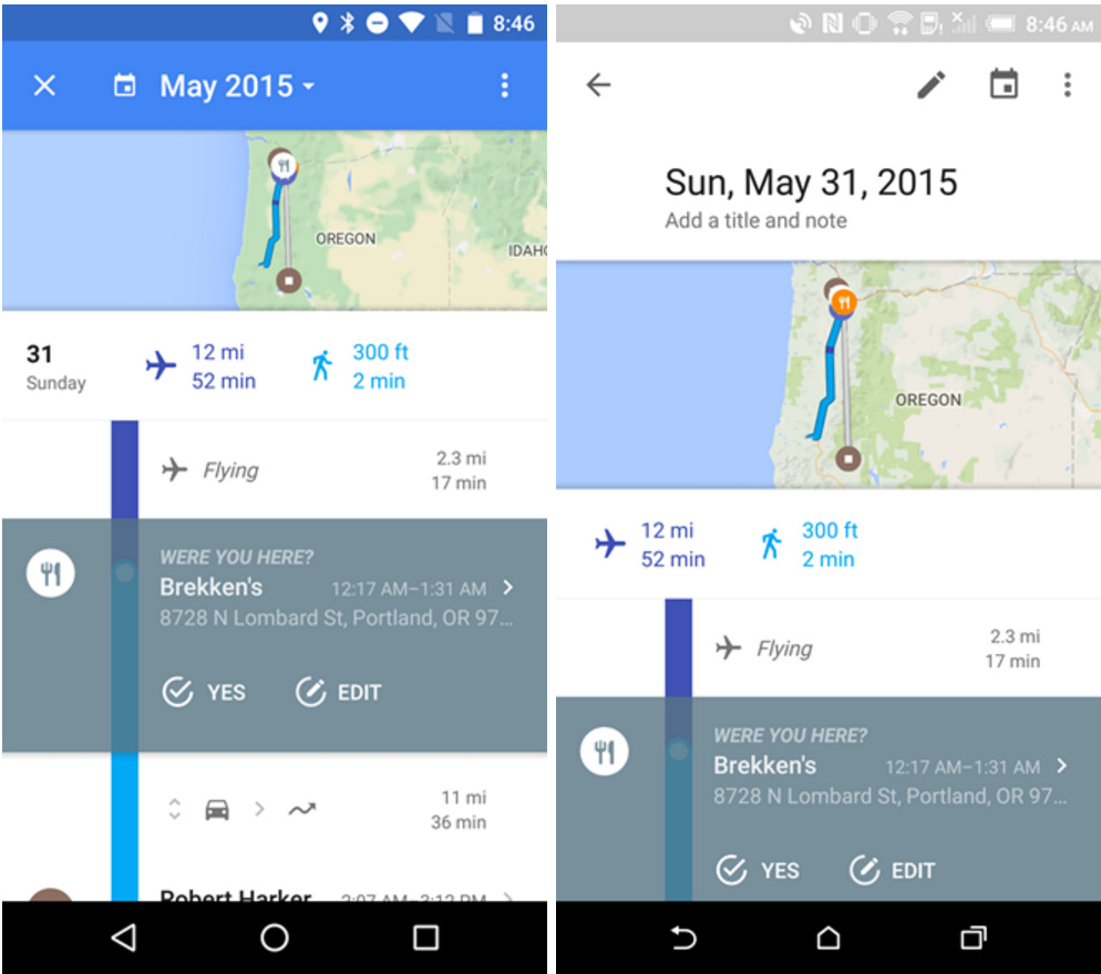 El timeline de Google Maps se ha rediseñado. Desaparecen los colores azules de la barra superior y tenemos más espacio para otras partes. El calendario se mueve de izquierda a derecha. Tenemos nuevos iconos para mostrar negocios y sitios y aparece un nuevo botón de edición que nos permitirá añadir notas y recordatorios en los viajes.