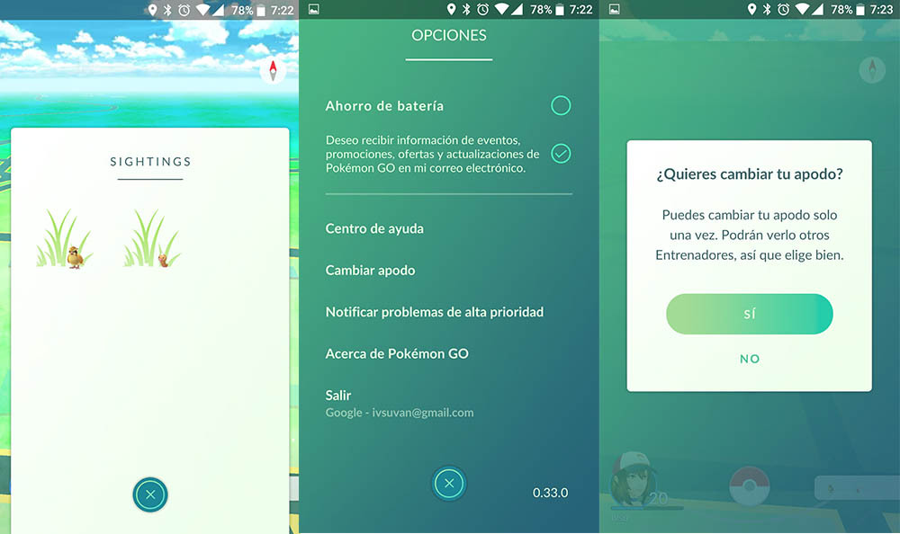 Cualquier mejora en la seguridad de la aplicación es bienvenida (no juegues conduciendo, que no hace falta que el juego avise). También la opción de cambiar el nick es bienvenida, así como la corrección de errores en el consumo. La hierba choca la primera vez que se abre el radar, igual que el «Sightings» sin traducir del encabezado. Quién sabe, puede que sea el primer paso para mejorar la búsqueda. ¿Hierba más frondosa significa que el Pokémon está más lejos y escondido? Podría ser.