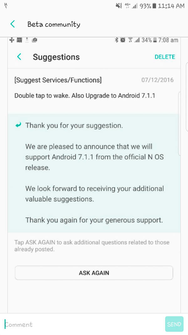 Esta noticia la ha confirmado el propio fabricante en el foro que mantiene para la comunidad que está probando la beta. Ante la pregunta de un usuario sobre si los Galaxy S7 se actualizarían a Android 7.1.1, el fabricante responde que, cuando se libere oficialmente la actualización, la OTA llevará la última versión de Android.
