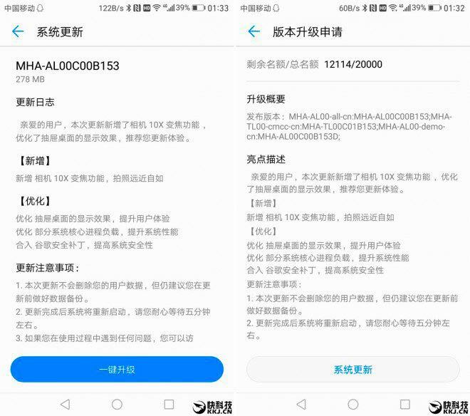 La actualización está marcada con la versión MHA AL00C00B153. Pesa 287 megas y se ha liberado de manera oficial en Asia con la promesa de ir llegando de manera progresiva al resto de Huawei Mate 9 distribuidos a lo largo y ancho del globo. Según la recibamos en nuestro móvil confirmaremos los cambios reseñados, especialmente en el uso de la cámara. Que ya mejoró mucho con la primera actualización.