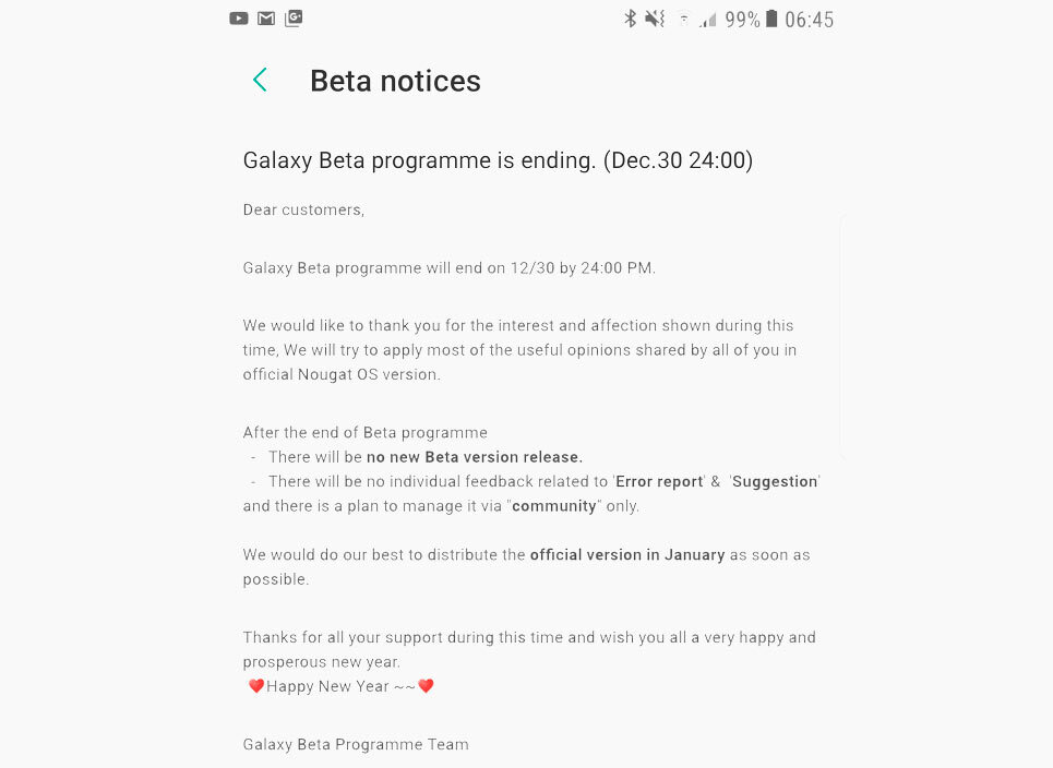 Después de un programa beta que ha dado mucho que hablar, tras cinco actualizaciones de dicho programa en las que hemos visto multitud de novedades para los móviles estrella de este año en Samsung… Es oficial: ese programa beta acaba justo hoy, 30 de diciembre de 2016. Así lo hace saber en un comunicado la compañía. Y pone fecha a la actualización oficial.