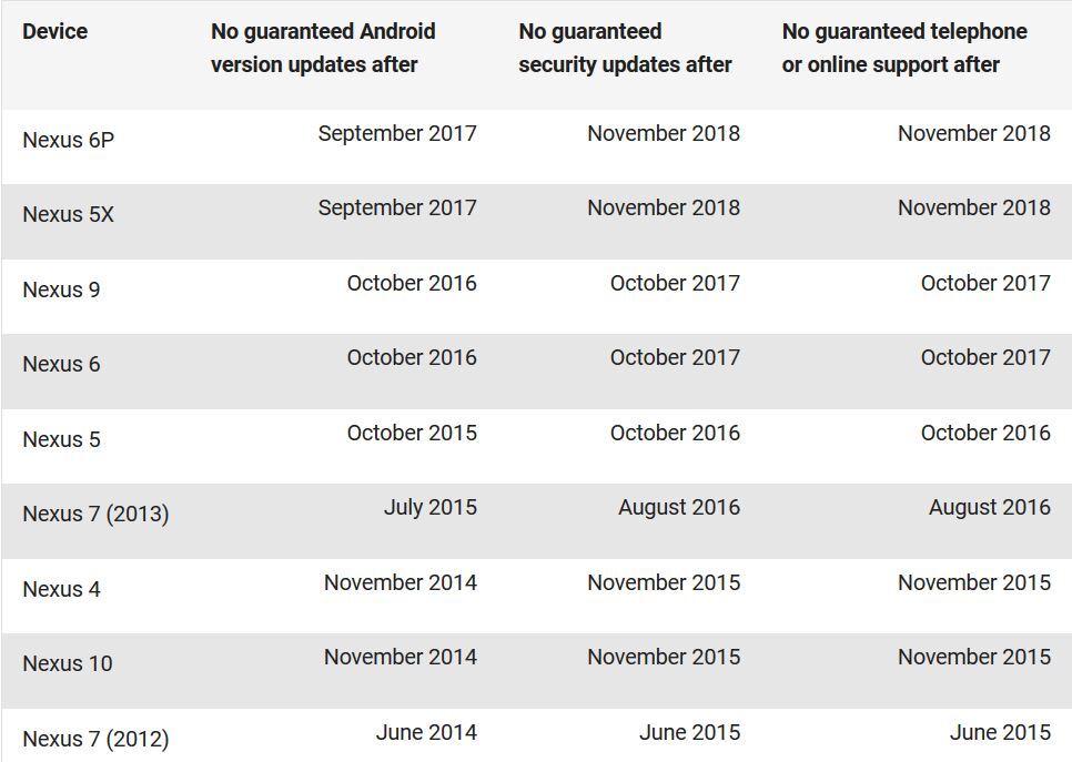 Actualmente los Nexus y Pixel de Google incluyen dos años de soporte y tres de actualizaciones de seguridad. La gran G ha actualizado su web de soporte, ampliando la fecha límite de actualizaciones en los Nexus 5X y 6P, pero únicamente en lo que respecta a actualizaciones de seguridad.