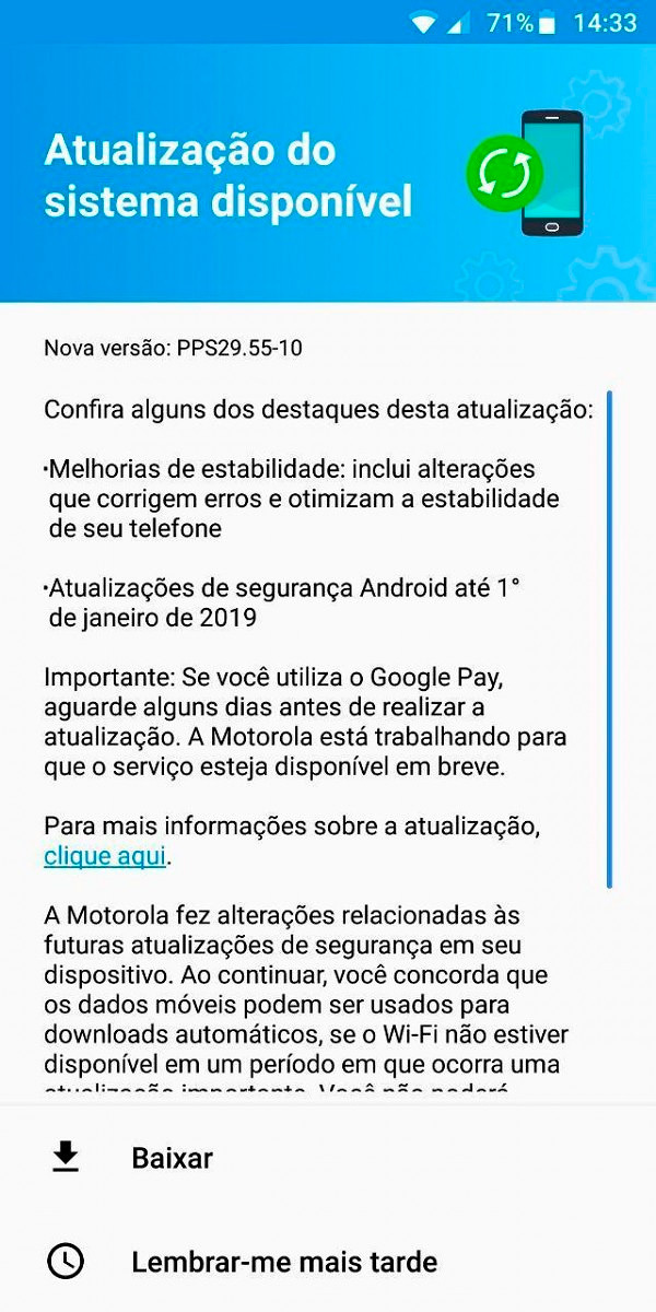 Como decimos, por ahora la OTA se está recibiendo en Brasil, posiblemente el mercado más importante aún para Motorola, el mismo en el que se presentarán en unos días los nuevos Moto G7.