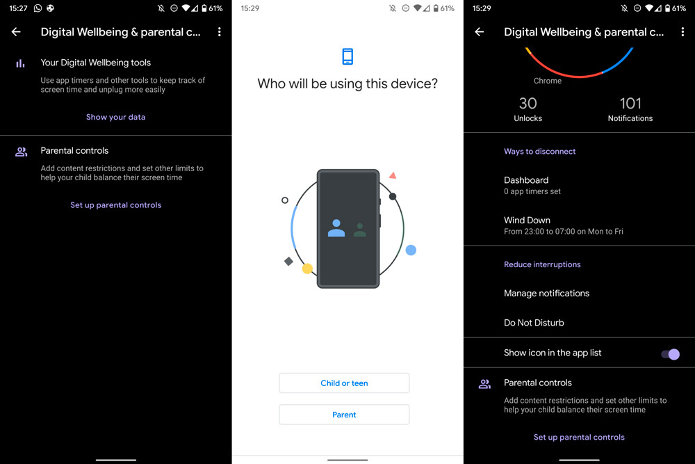 Esto hace que en los ajustes de Bienestar Digital aparezca una nueva sección llamada Control Parental, que permite configurar Family Link, la aplicación de la que hablábamos antes. Si no la tenemos configurada el sistema nos invitará a instalarla y crear los patrones de uso que estimemos convenientes.