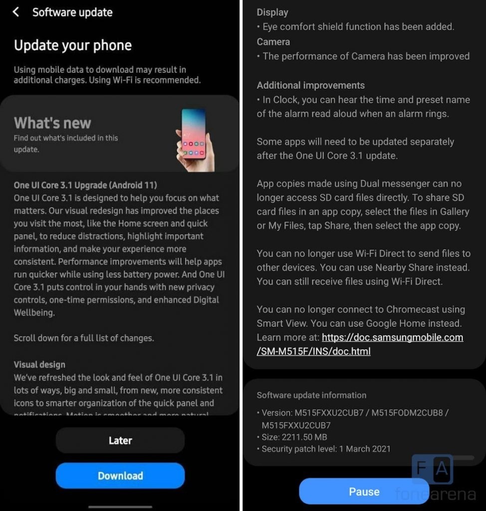 La actualización estaba prevista para el mes de abril, pero Samsung ha adelantado el despliegue de la misma. Esta actualización tiene el número de serie M515FXXU2CUB7 y su peso es de 2,21 GB, así que es mejor usar WiFi a la hora de instalarla, en el caso de tener una tarifa de datos limitada. Junto a la actualización se lanza el parche de seguridad de marzo de 2021.