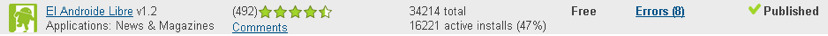 En este caso, podemos ver que la app de El Androide Libre tiene a día de hoy 34214 Instalaciones únicas (por cuenta de usuario, no se cuenta si tienes 5 androids con la app instalada y el mismo usuario) y de estas instalaciones, se mantienen como promedio, activas 16221.