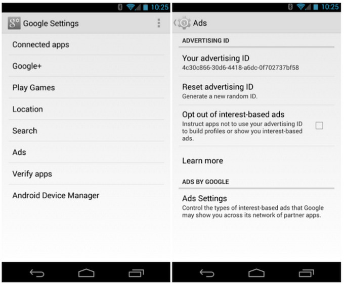 Ahora se introduce el nuevo Advertising ID, un identificador que forma parte de los nuevos Google Play Services 4.0 . Se trata de un estándar UUID que ya ha sido utilizado en otras conocidas plataformas móviles y que se enlazará con nuestra cuenta Google. Tendremos un código único (uno por dispositivo) con el que podremos asociar la publicidad que recibimos en él. Los desarrolladores llamarán a este ID en el momento en que inserten el banner y funcionará mientras tengamos la opción de ads personalizadas habilitada.