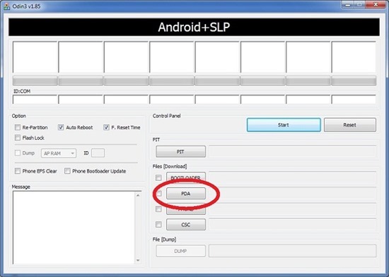 • Abre el Odin y pulsa el botón PDA como en la imagen. Selecciona el archivo CF-Auto-roo….tar.md5 que hemos extraído antes.