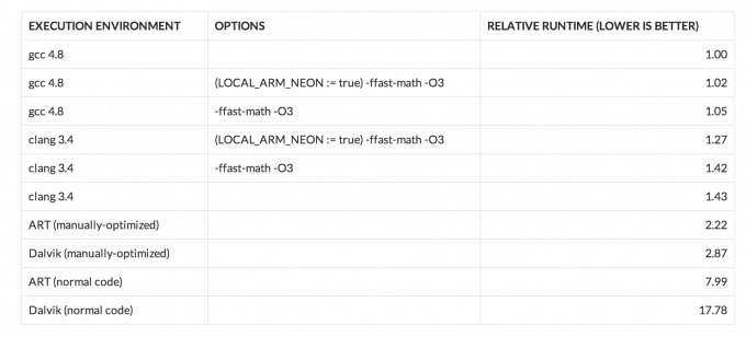 Unos resultados que demuestran lo increíblemente rápido que es C, el gran trabajo a pesar de ser una beta todavía que se ha hecho con ART y como de lenta es la ya algo antigua Dalvik.