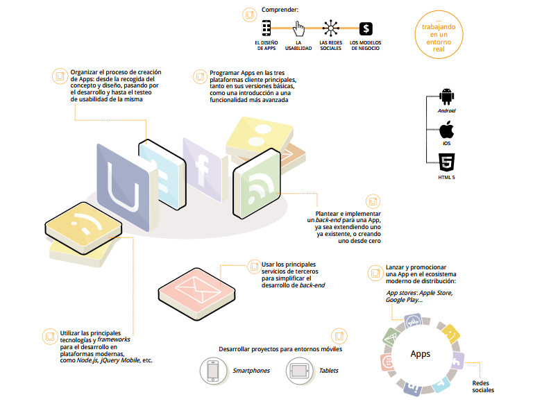 Para ser exactos, lo que se aprende en las clases es todo lo necesario para ser un buen programador: saber cómo funcionan los mercados de aplicaciones, el diseño de las aplicaciones, programación en Android, en iOS, toda la infraestructura que podamos necesitar para hacer funcionar nuestro proyecto, y un poco de HTML5 para adaptarse a los nuevos tiempos. También existen talleres de trabajo en equipo y comunicación, y el proyecto final es lanzar una aplicación que aplique todo lo que se ha aprendido a lo largo del curso.
