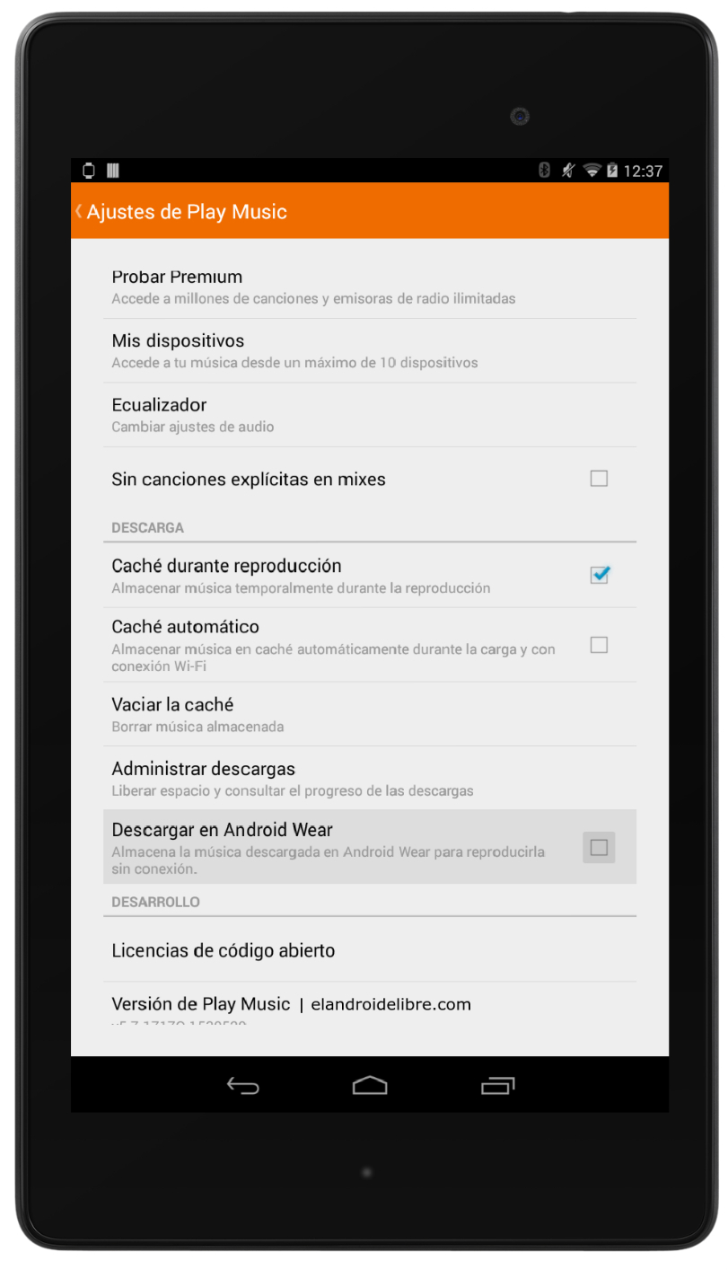 Simplemente entramos desde nuestro smartphone o tablet a la app de Google Play Music y seleccionamos la música que queremos descargar desde el menú, como siempre lo hemos hecho, y además, en la configuración de la app hay que marcar la opción «Descargar en Android Wear», que podéis ver en la siguiente captura.