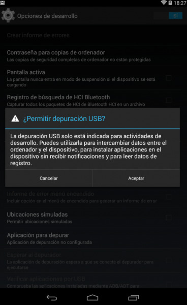 Una vez hecho esto, debemos estar seguros que dejamos activa la opción Depuración USB.