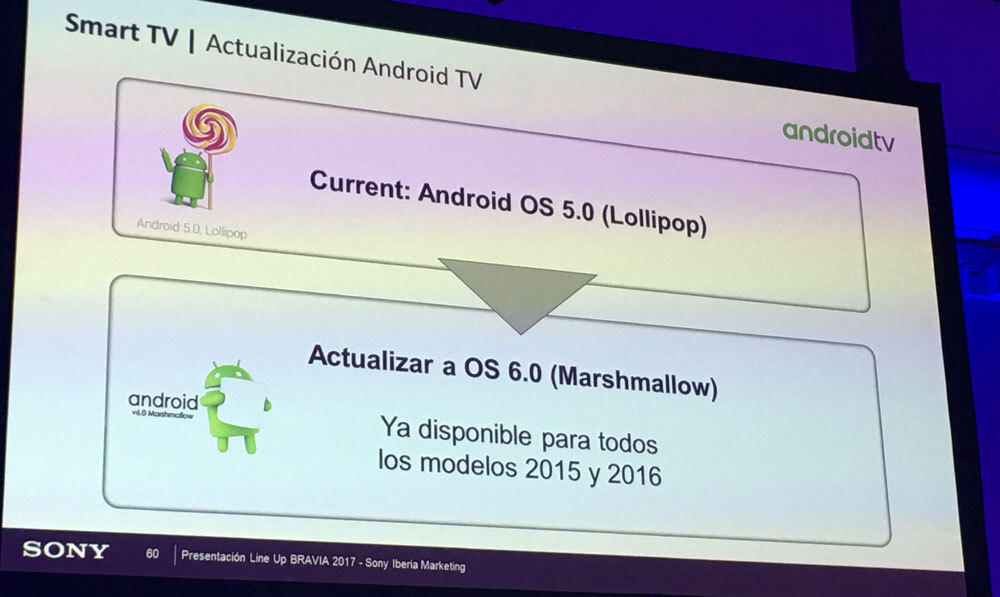 Hoy, durante un evento de presentación de su nueva gama de televisiones, Sony ha confirmado que Android 6.0 Marshmallow ya está disponible para todos los modelos de 2015 y 2016. Todas estas televisiones partieron con Android 5.0 Lollipop al mercado, y es ahora cuando se actualizan a Marshmallow.